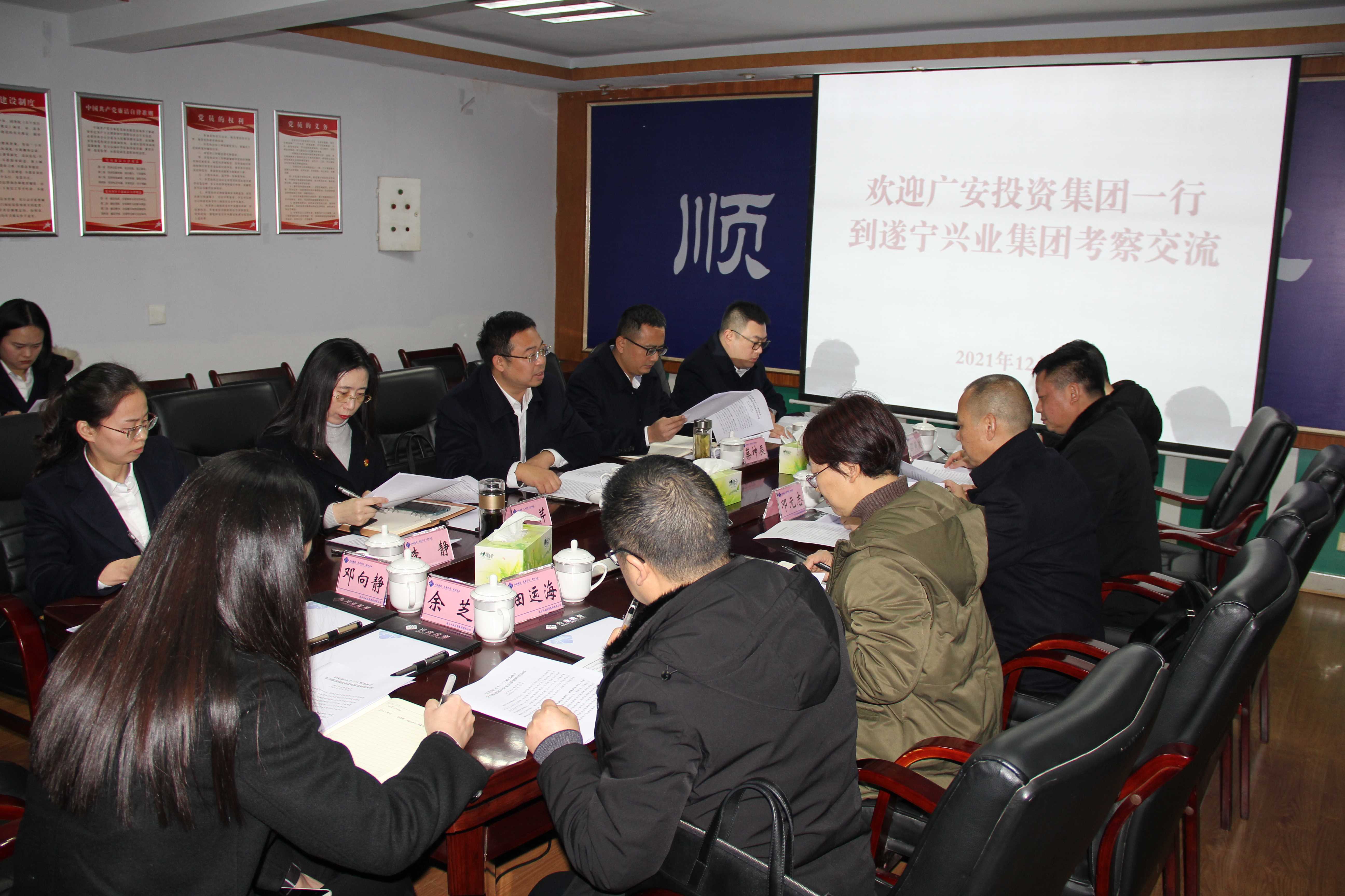 ? ? 2021年12月28日,廣安投資集團黨委專職副書記鄧元志,黨委委員、紀委書記李桂瓊一行7人到遂寧興業(yè)集團考察交流學(xué)習(xí)。集團黨委副書記、監(jiān)事會主席、工會主席石鎮(zhèn)槐,集團黨委委員、紀委書記蔡坤辰陪同考察,并參加座談交流。? ?